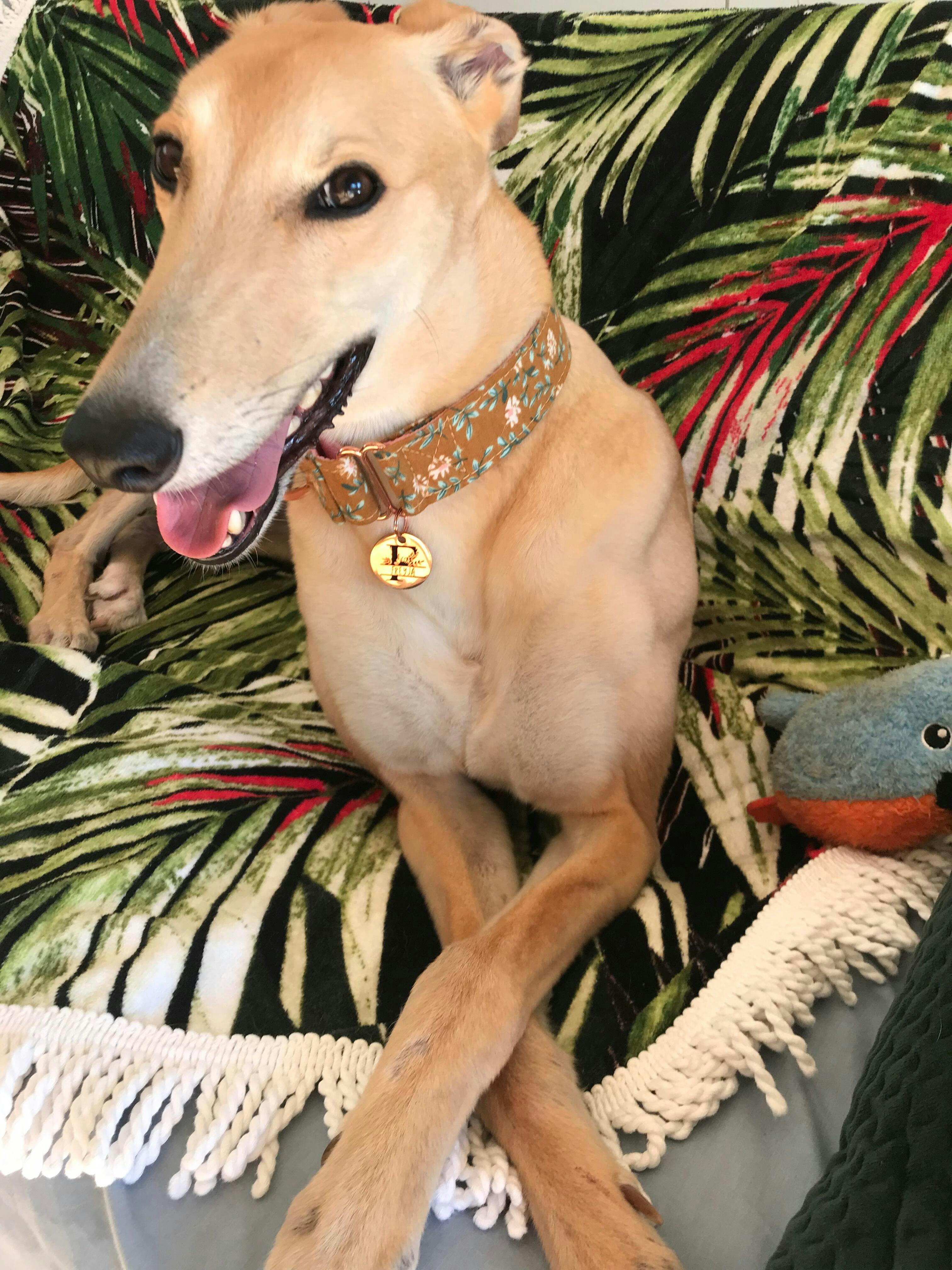 If you are not familiar with a martingale collar, it's an ingenious invention in the dog world. You may see our beautiful collars often showcased on gorgeous greyhounds, because those gracious creatures are renowned for slipping out of ordinary collars. It happens because their pointy heads are narrower than their slender necks. Our martingale collars feature a smaller loop that gently tightens while walking on a leash, preventing those incredible beings from slipping out and getting up to mischief. The clever little loop also assists in guiding the dog while training, making it perfect if you have a dog that can't resist but sniff each and every blade of grass.