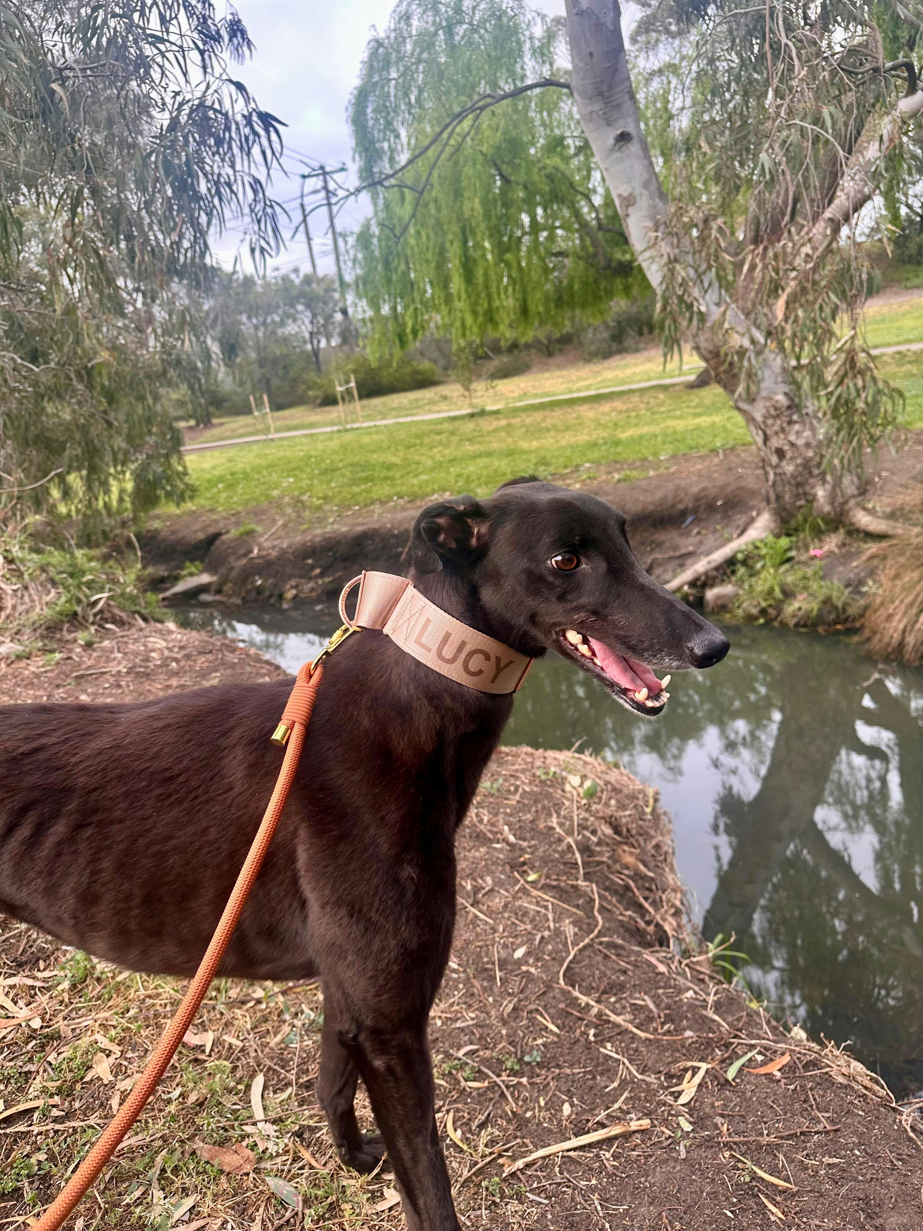 Hand-crafted in Australia from durable silky cream nylon that refuses to fray at the edges. We have also lined this collar with soft neoprene padding setting it apart from the rest, this martingale collars offer unmatched security and comfort for sleek slender necks. The unique design ensures a snug fit without compromising on comfort, making it an ideal choice for breeds like Greyhounds, Whippets, and other sighthounds, as well as dogs with small heads and larger necks. Plus, it's the perfect solution for hounds prone to slipping out of traditional collars.