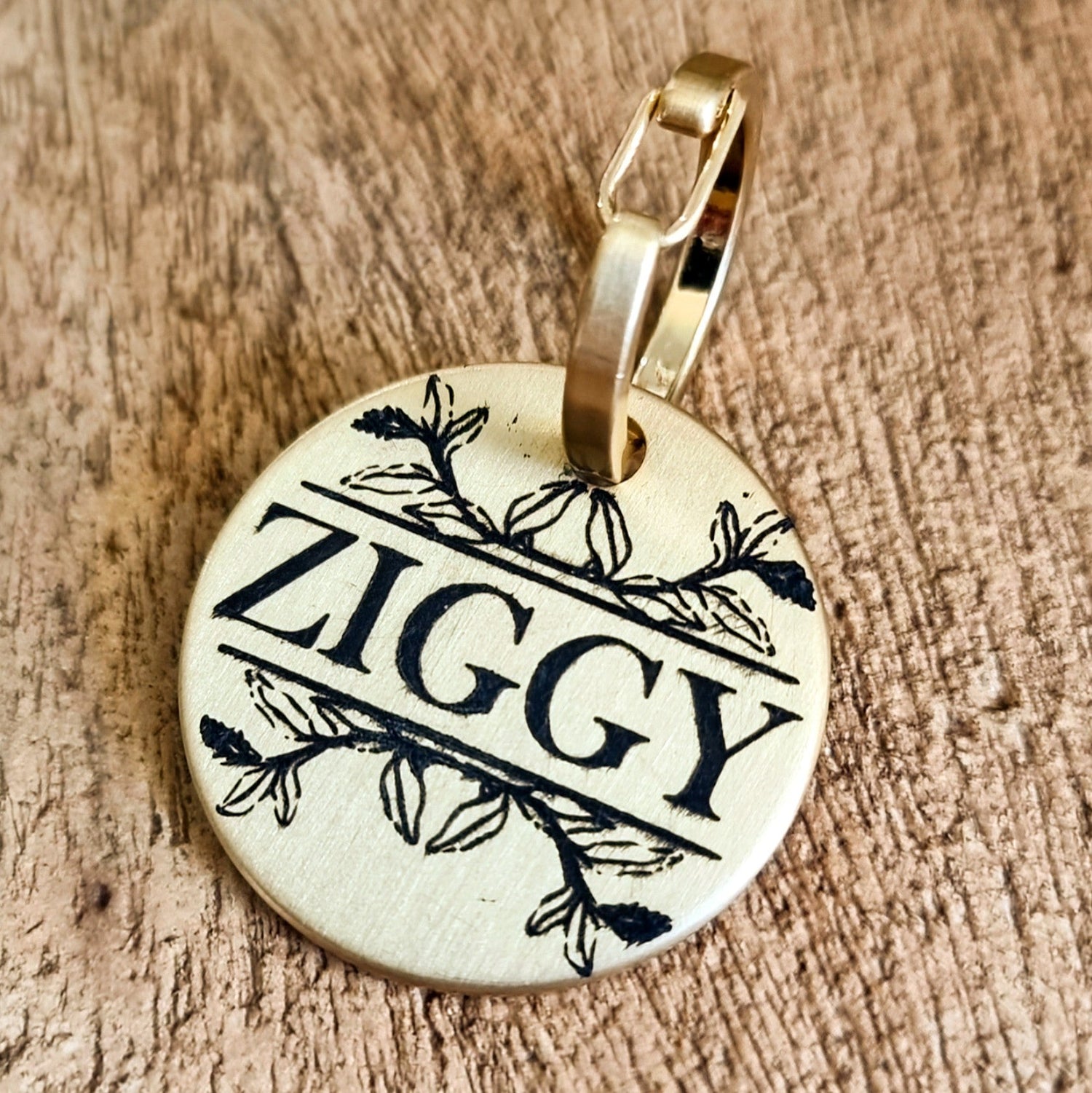 The GINGER Dog Tag. Meticulously crafted, this tag features a deep engraving of your beloved hound's name on the front bordered by subtle gingle flowers. The tag’s surface shines with a luxurious shiny finish, contrasted by sleek black infill that enhances its striking design. With a diameter of 30mm and a robust 2mm thickness, The Ginger is built to withstand daily wear, offering superior strength compared to traditional, flimsy dog tags.