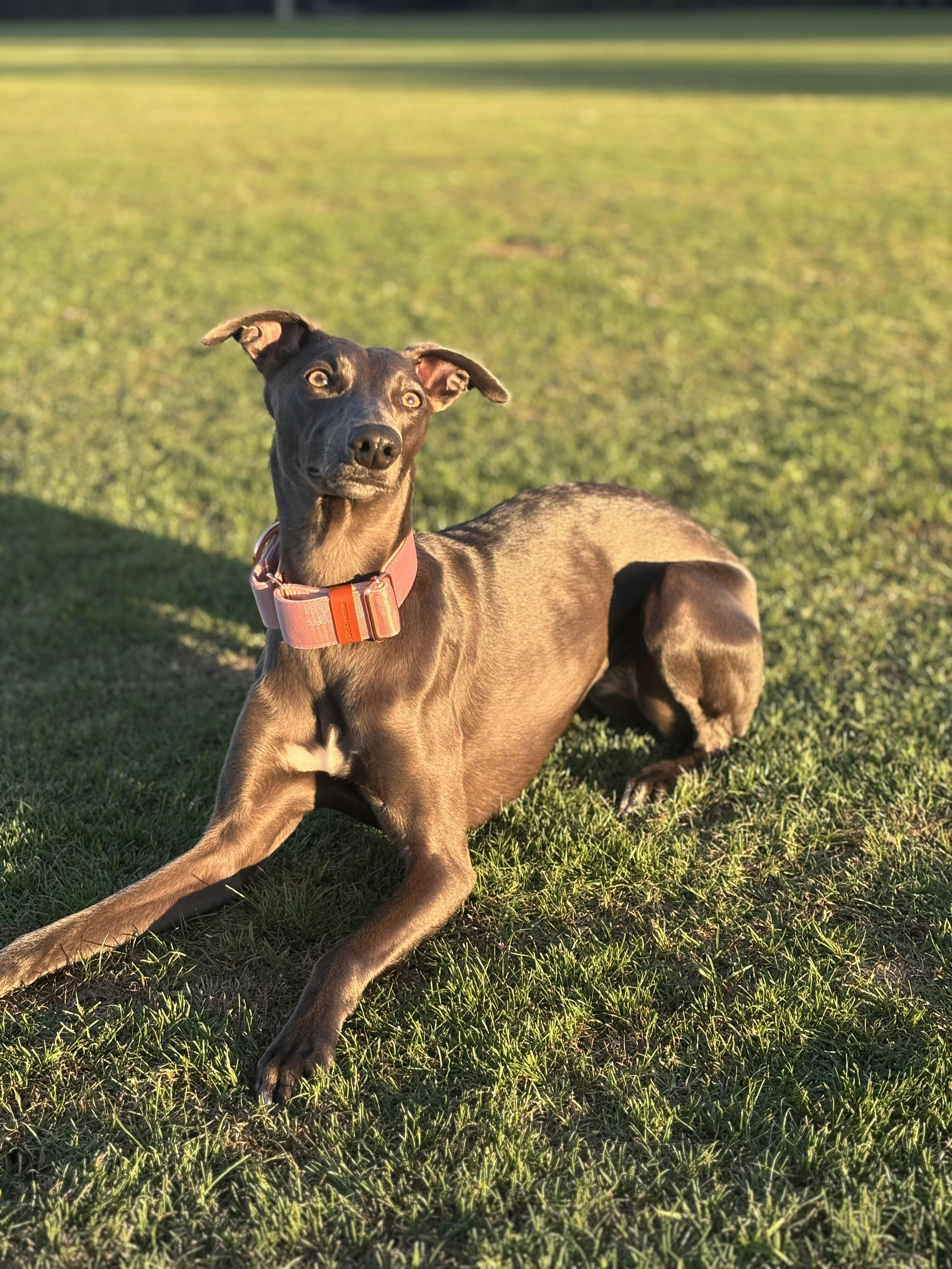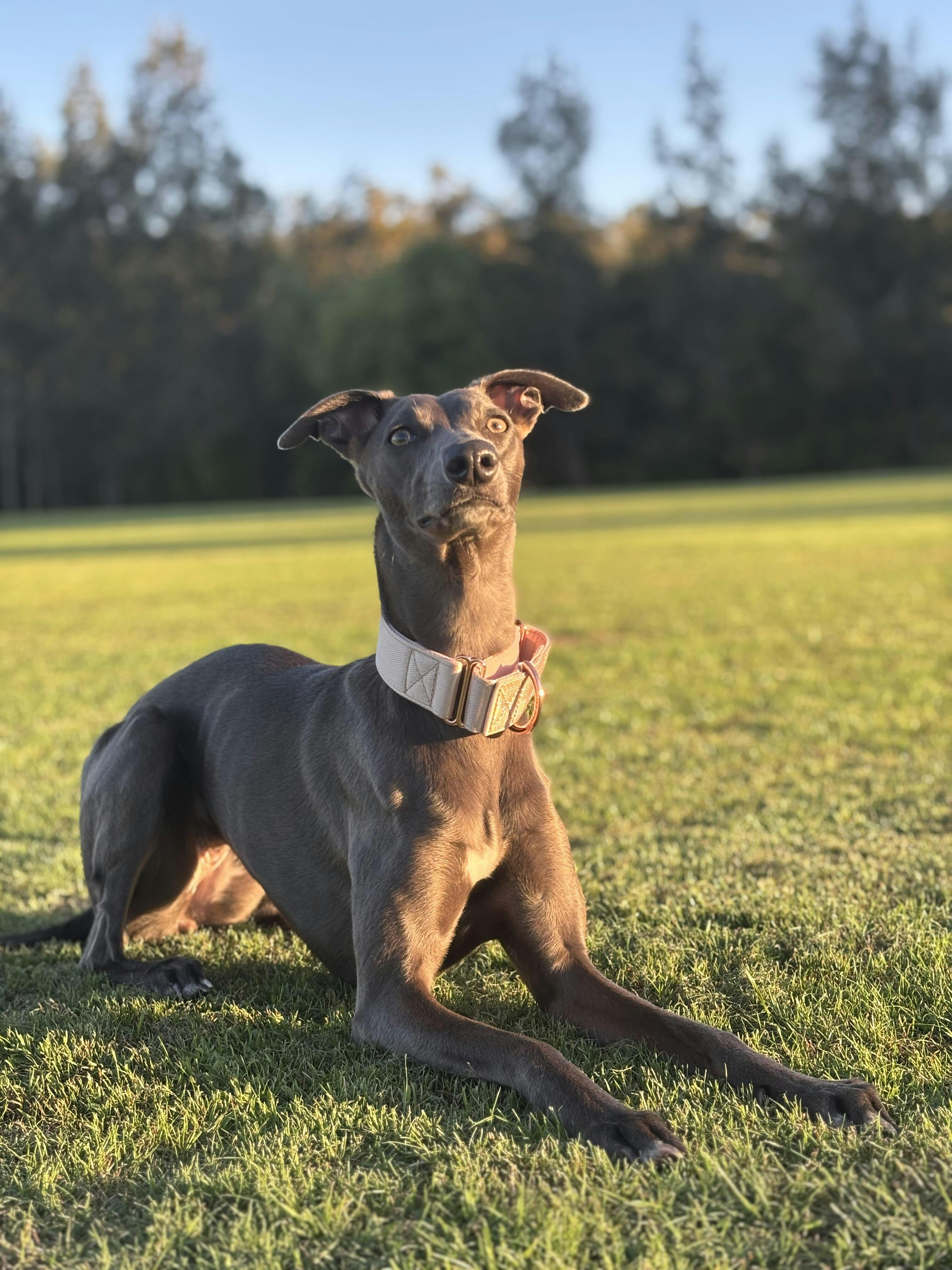 The inside is lined with buttery-soft neoprene padding (in the cutest blush beige), giving your hound a cloud-like fit around their neck. Especially great for Greyhounds, Whippets, and other sighthound superstars, the martingale design keeps things secure without any harsh tugging—ideal for pups with slender heads and a knack for slipping out of regular collars!