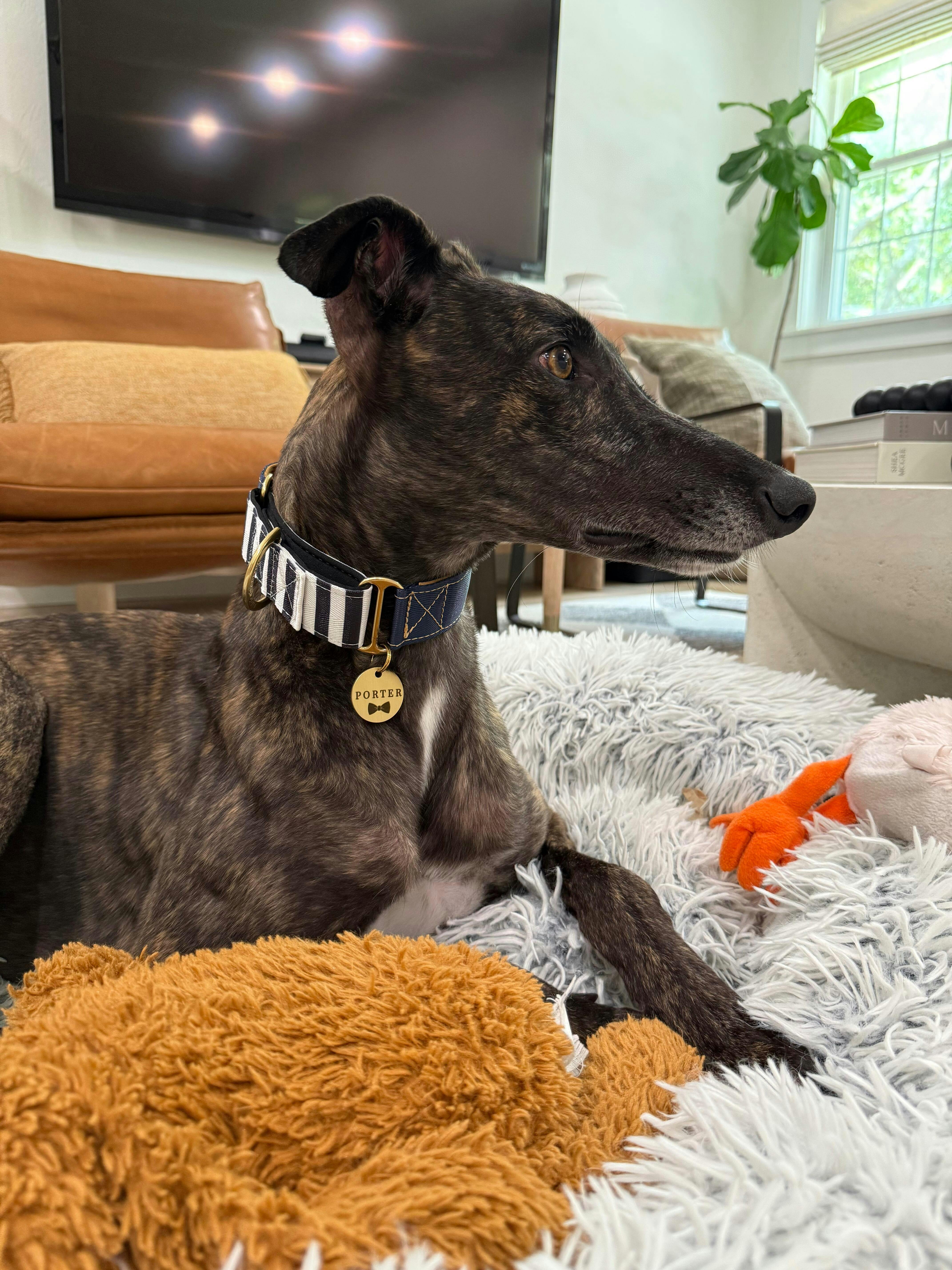 What sets this collar apart? It’s more durable than most martingales on the market, designed with quality materials that hold up to real dog life. Choose from solid brass or black hardware for a custom finish that suits your dog’s style. For an extra touch, you can upgrade to include a matching engraved ID tag—stamped with your pet’s name and number, right here in my studio.