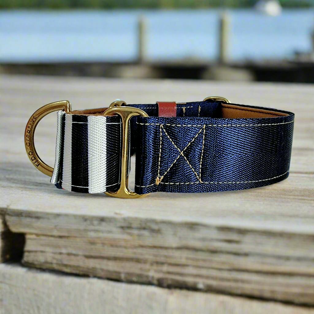 The front martingale loop features bold black and white stripes that channel crisp nautical vibes, while the neck strap is a deep navy blue for that classic maritime touch. Inside, the entire collar is lined with a beautifully contrasting golden brown padding—soft against your dog’s neck yet sturdy enough for everyday wear.