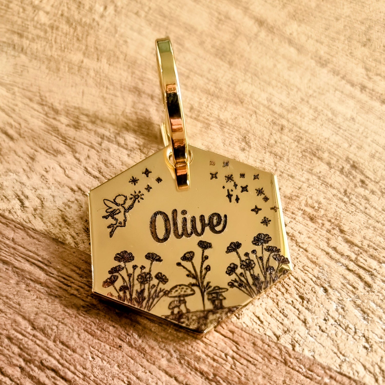 Add a sprinkle of whimsy to your dog’s collar with our Pixie Hexagon ID Tag. Deep engraved with a delicate floral pixie design and your pup’s name on the front, it’s the perfect blend of charm and practicality. Flip it over and you’ll find your contact details ready to help your little wanderer find their way home (just in case the pixie dust wears off).