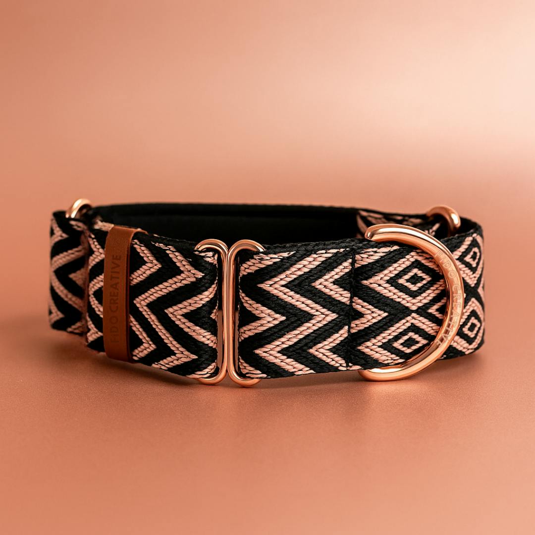 Crafted from luxury black and blush-pink diamond jacquard, this collar combines sophistication with the comfort your hound deserves. The soft black neoprene padding ensures a gentle fit, perfect for sensitive necks, while the martingale design offers safety and control without harshness.