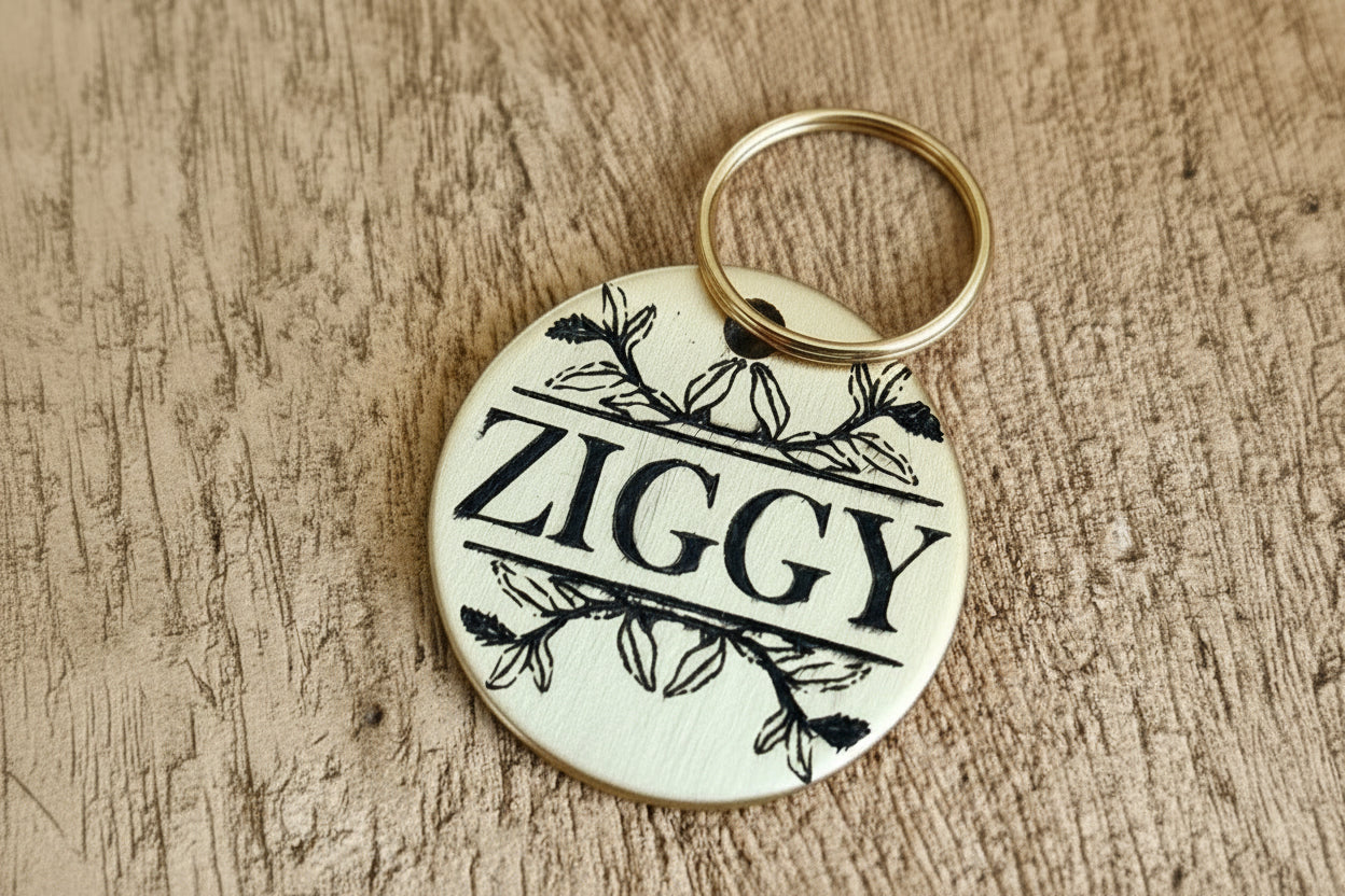 The GINGER Dog Tag. Meticulously crafted, this tag features a deep engraving of your beloved hound's name on the front bordered by subtle gingle flowers. The tag’s surface shines with a luxurious shiny finish, contrasted by sleek black infill that enhances its striking design. With a diameter of 30mm and a robust 2mm thickness, The Ginger is built to withstand daily wear, offering superior strength compared to traditional, flimsy dog tags.