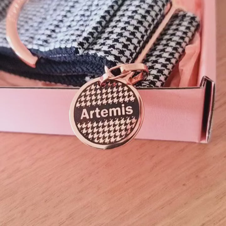 The Houndstooth Dog Tag – a stunning blend of sophistication and durability. Meticulously crafted, this tag features a deep engraving of your beloved hound's name on the front, complemented by an elegant houndstooth pattern that exudes timeless class. The tag’s surface shines with a luxurious rose gold finish, contrasted by sleek black infill that enhances its striking design. With a diameter of 30mm and a robust 2mm thickness, The Houndstooth is built to withstand daily wear, offering superior strength compared to traditional, flimsy dog tags.
