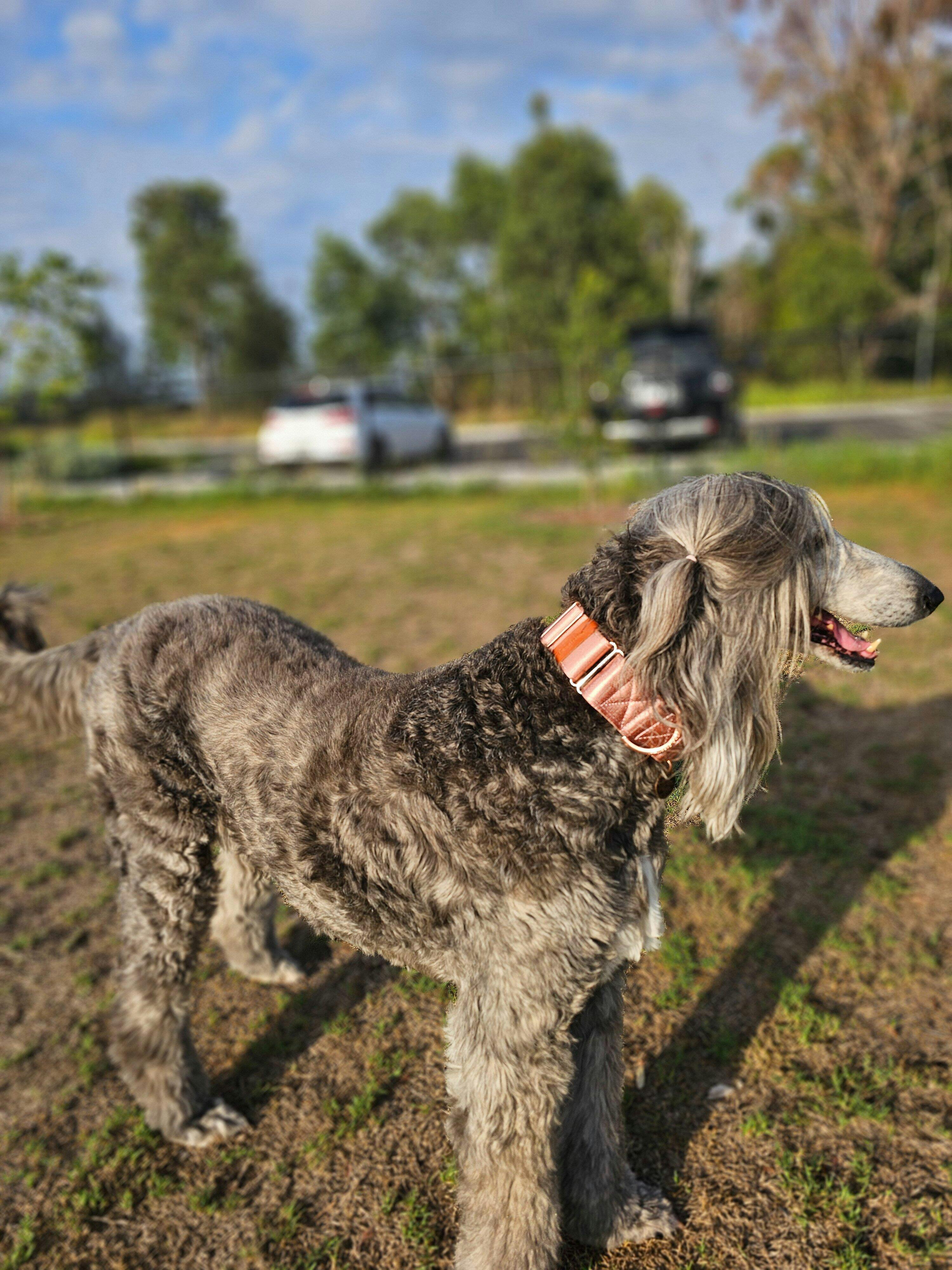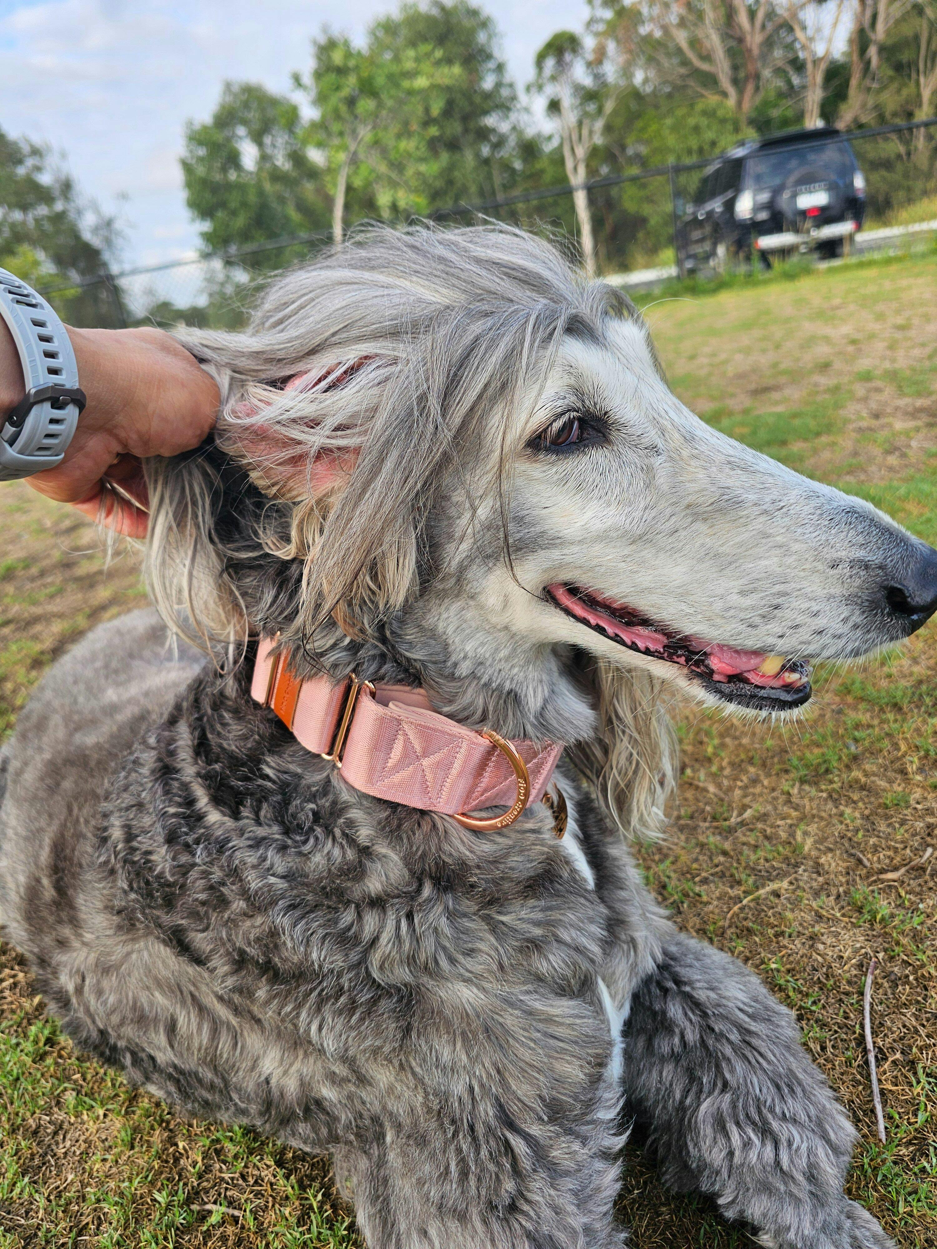 The inside is lined with buttery-soft neoprene padding (in the cutest blush beige), giving your hound a cloud-like fit around their neck. Especially great for Greyhounds, Whippets, and other sighthound superstars, the martingale design keeps things secure without any harsh tugging—ideal for pups with slender heads and a knack for slipping out of regular collars!