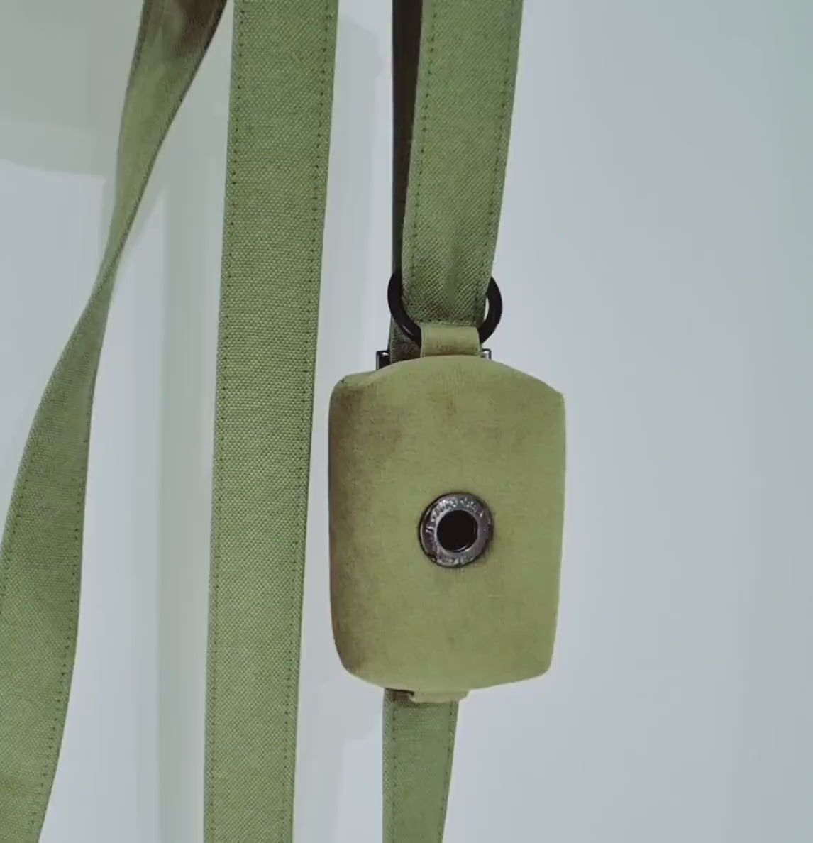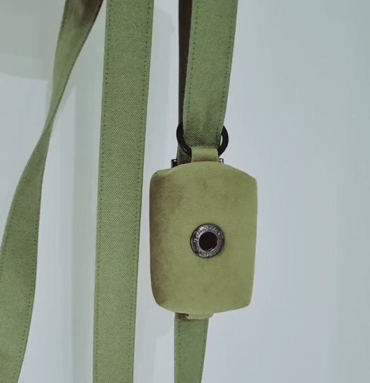 Green velvet dog poop bag holder. This olive green dog waste bag holder is equipped with two ring clips, it easily attaches to any leash - simply clip one directly onto the handle, and the other around the leash for a tidy and stylish walk