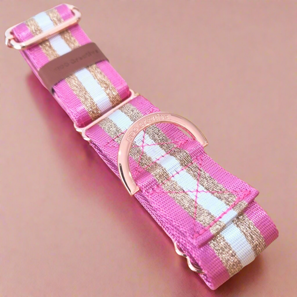 The 1.5" wide luxurious Pink and Rose Gold Martingale Collar, a statement piece that blends style and function flawlessly. This shimmery martingale collar can be a personalised martingale collar and is adorned with elegant pink, white, and glittery rose gold stripes, ensuring your dog stands out on every walk. Paired with exquisite rose gold hardware, this collar is both fashionable and durable.